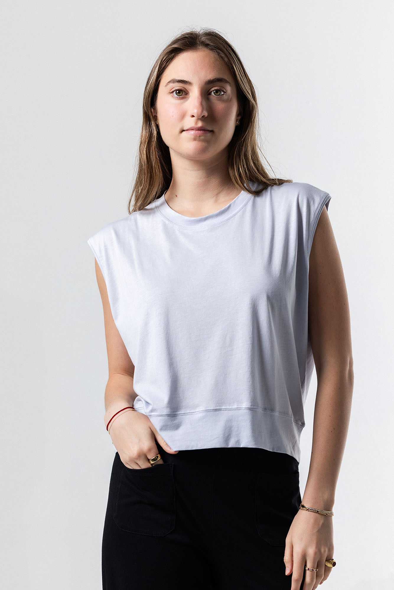 This sleeveless muscle crop has a boxy, waist-length cut with dropped shoulders for a modern, athletic edge. Pairs easily with our Straight Leg Pants, Soft Blazer, or your favorite jeans.