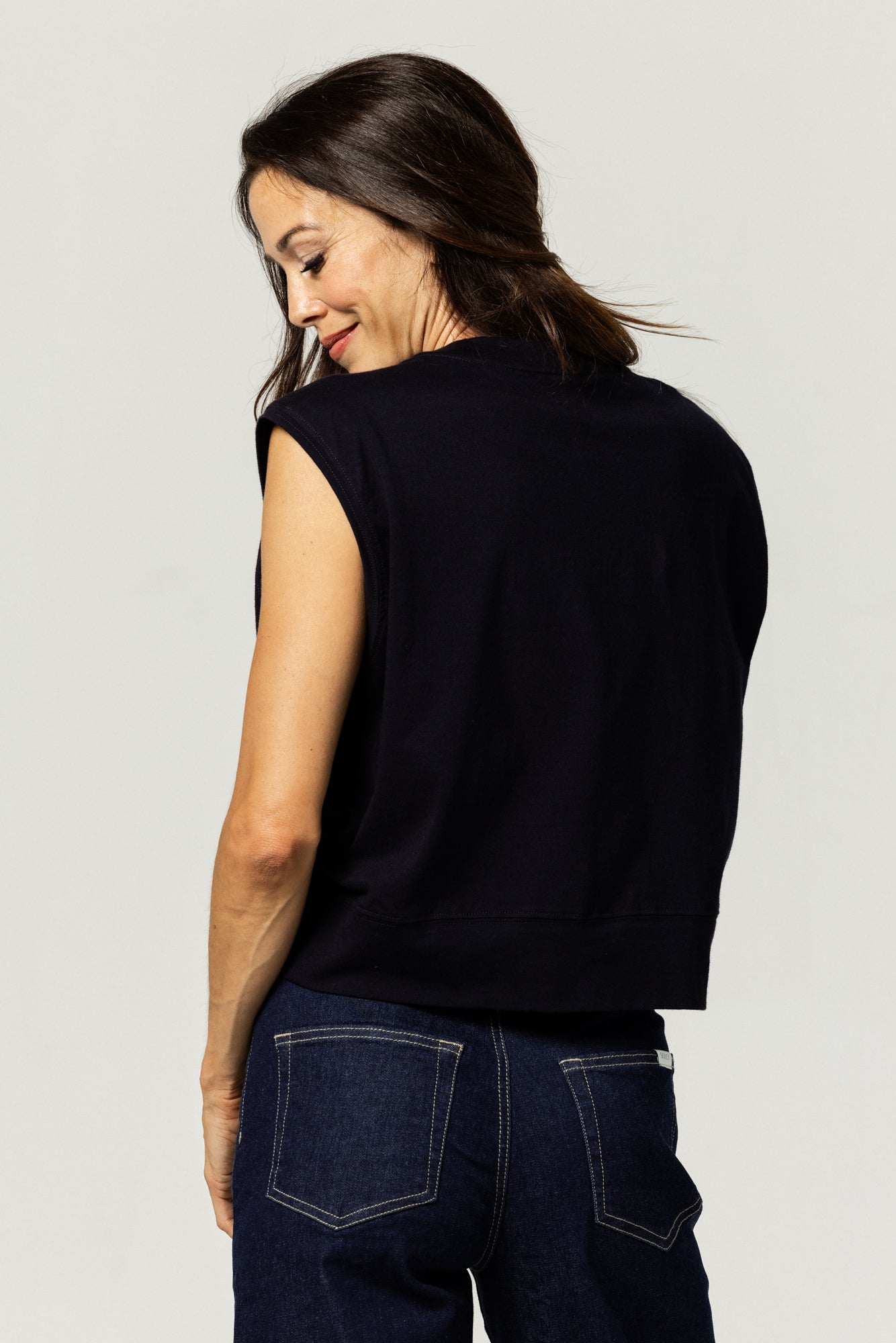 This sleeveless muscle crop has a boxy, waist-length cut with dropped shoulders for a modern, athletic edge. Pairs easily with our Straight Leg Pants, Soft Blazer, or your favorite jeans.