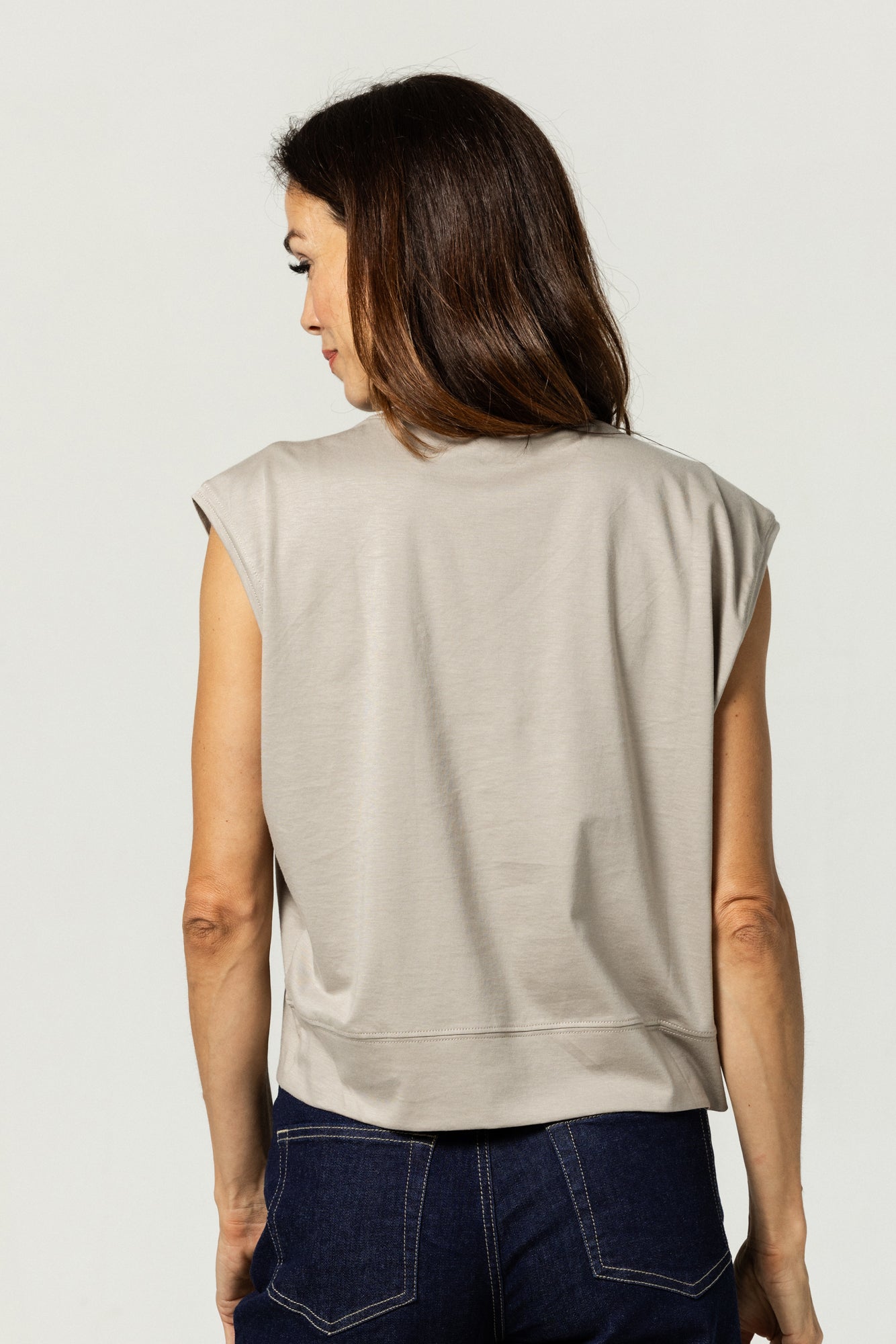 This sleeveless muscle crop has a boxy, waist-length cut with dropped shoulders for a modern, athletic edge. Pairs easily with our Straight Leg Pants, Soft Blazer, or your favorite jeans.